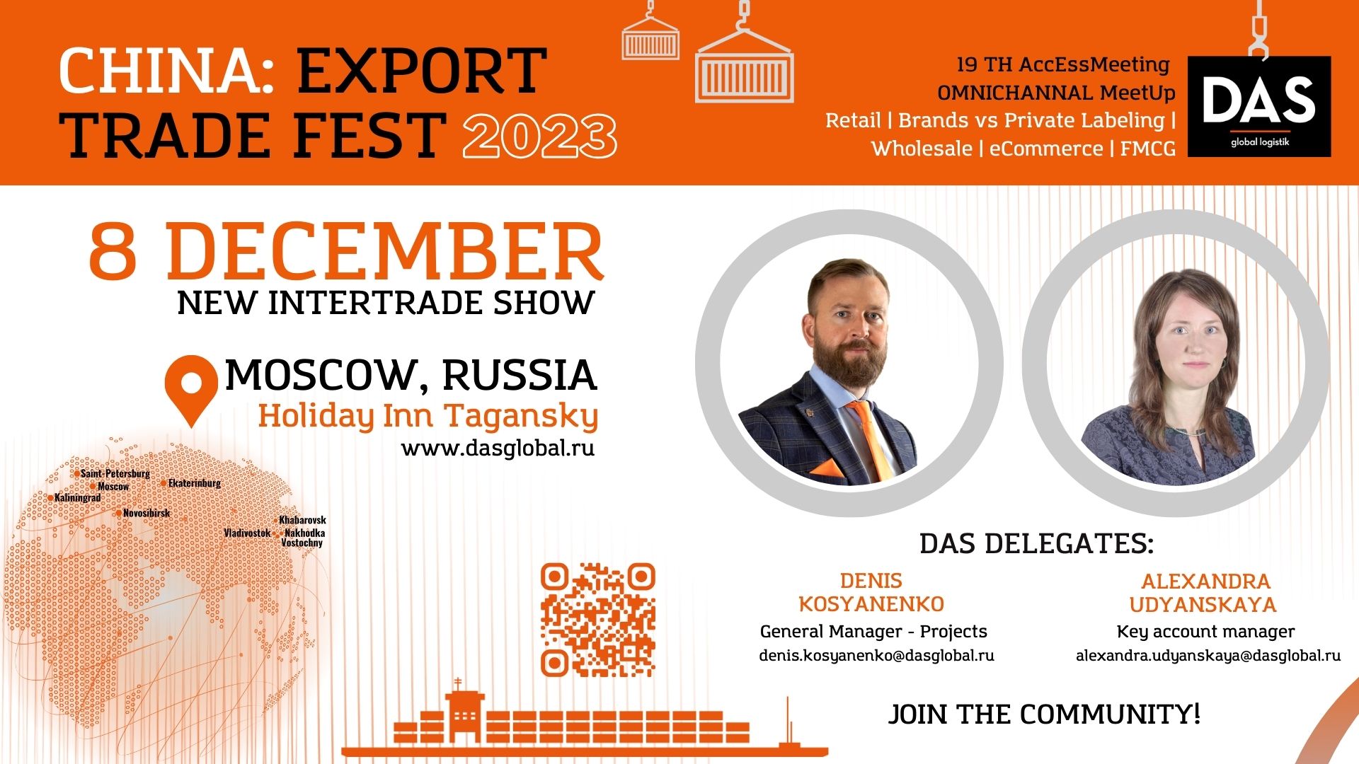 Со стороны России экспертом в области налаживания торговых отношений на международных рынках выступит компания DAS GLOBAL LOGISTIK в лице Дениса Косьяненко, руководителя международного отдела по развитию бизнеса и Александры Удянской, руководителя группы по развитию бизнеса ключевых клиентов. Денис Косьяненко, руководитель международного отдела по развитию бизнеса компании DAS GLOBAL LOGISTIK, проведет 30 минутную открытую сессию и представит презентацию по возможностям компании DAS GLOBAL LOGISTIK на мировом рынке, логистическим решениям компании, и коснется рисков, с которыми встречается мировая логистика, а также проконсультирует участников мероприятия и ответит на вопросы в сфере логистики внутри России и за ее пределами.